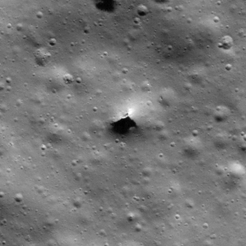 | Desc. | Possibly not a pit. Much darker/larger shadow than nearby craters, but cannot distinguish any walls for certain. There may be a corner between NE and NW walls visible in most images, and a possible outcrop on the SE funnel. |