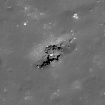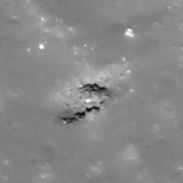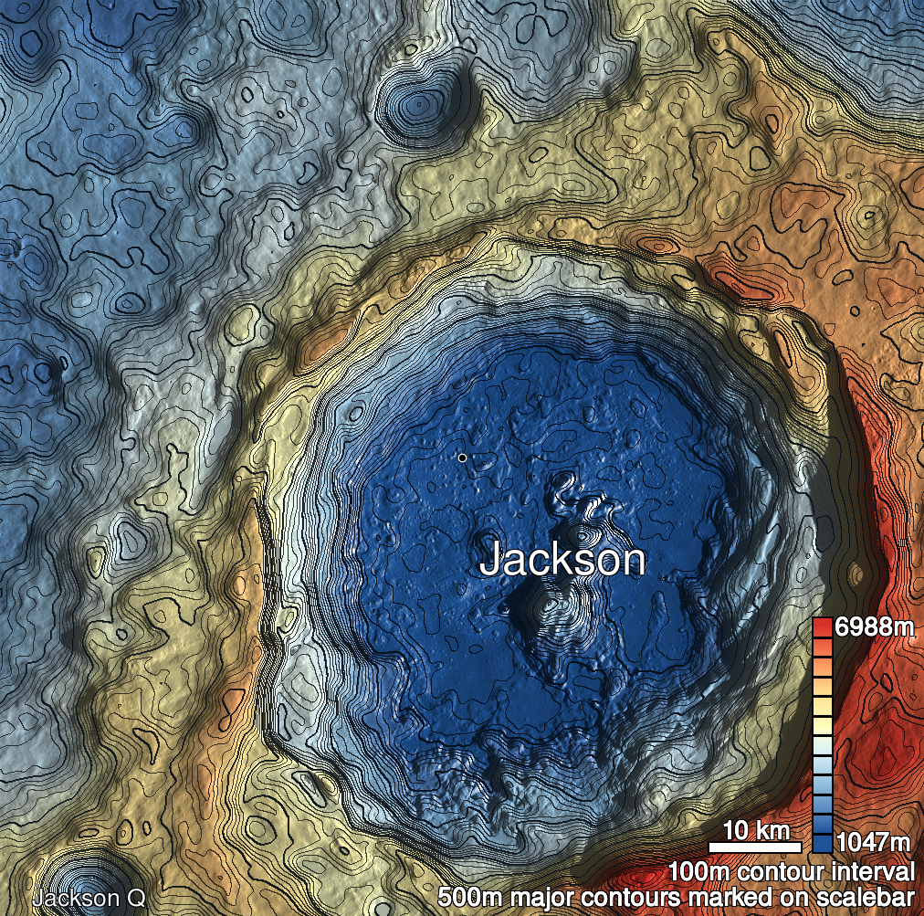 | Desc. | Eastern of the Jackson 1 pit chain. Elliptical, with both east and west ends having a smooth slope to the floor (western end, at least, is in self-cast shadow at 45 degree incidence angle!). Center of the pit is a large block of fractured rock, rising to level with surrounding terrain. |