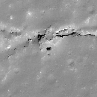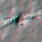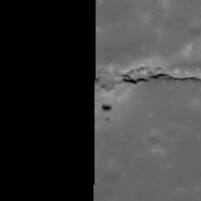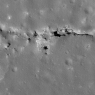| Desc. | Very deep elliptical pit in the south wall of a positive relief feature. The PRF cuts across a fracture that is running E-W, and there is a confirmed ~5m overhang where a wide fracture pit runs under the PRF (eyeballing the available stereo data and measuring shadows in the fracture pit, the PRF is ~10-15m tall, and the fracture pit is ~5-10m below the surrounding terrain). |