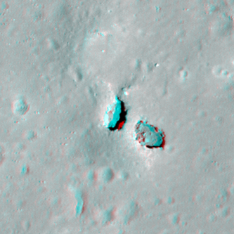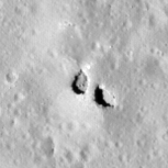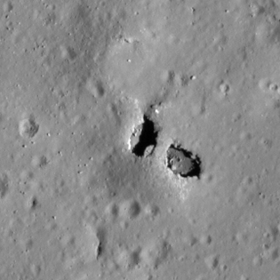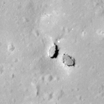 Elliptical pit, northwestern of two pits in a PRF. The two pits are separated by a bridge, 19m long, ~9.5m wide at the narrowest point. The cross-sectional thickness is ~5-7m at an angle ~45 degrees off vertical, depending on the image measured and how close to flat the ground the shadow is on is (implying a ~4m vertical thickness if the bridge has an elliptical cross-section). The S end of the bridge is the highest point on the PRF, and the N end is near the base. The floor of this pit slopes down towards a point under the S end of the bridge, and there is a scattering of 1-3m boulders on the floor. There is a possible 1-2m wide break in the rim in the N, leading into a ~40m wide shallow depression, although high-Sun images suggest that there is still a 1-2m drop at the lowest point. Other nearby features are a string of tiny pits/fractures connected by depressions ~100m N, roughly in line with King 1a and the depression just N of it; a ~5m fracture in a depression ~65m S, also in line with the northern features; and a string of small depressions ~220m S. |
