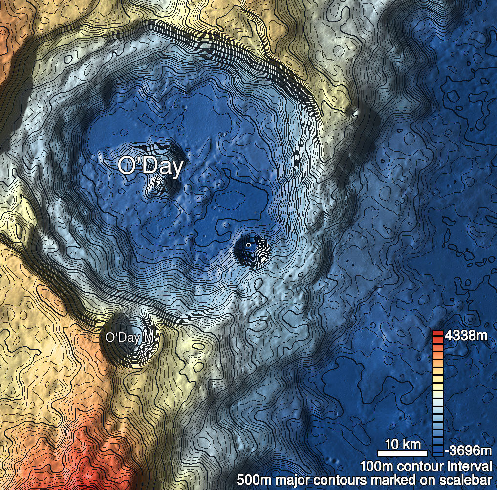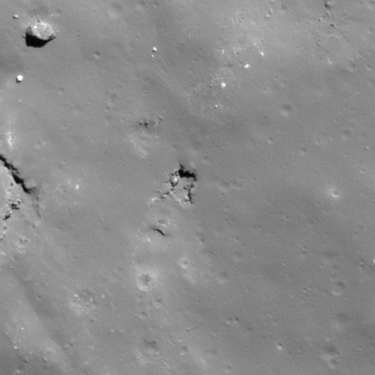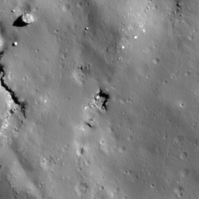 | Desc. | Rectangular pit ~150m from the crater wall, SW wall is a nearly uninterrupted slope to surface. There are more depressions and collapses to the SW suggesting a larger partially-collapsed void space, with possible uncollapsed bridge. Subtle PRF just to the NE. Linear collapse/fracture ~65m W. |