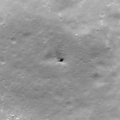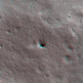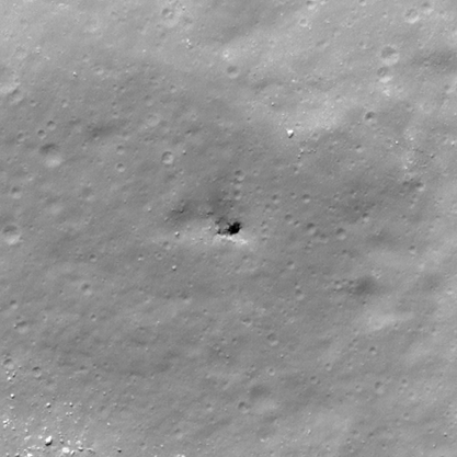 | Desc. | Elliptical pit, with a comparably-sized elliptical depression running at right-angles NW from the SW end. This second depression appears to have a 1-2m rounded(?) rim, and slopes down into the main pit, but may not get near the floor. It is unclear if the floor of the main pit is visible in any images, though the very tip of a boulder may be slightly illuminated ~2m down in M154873550L. No nearby features of note. |