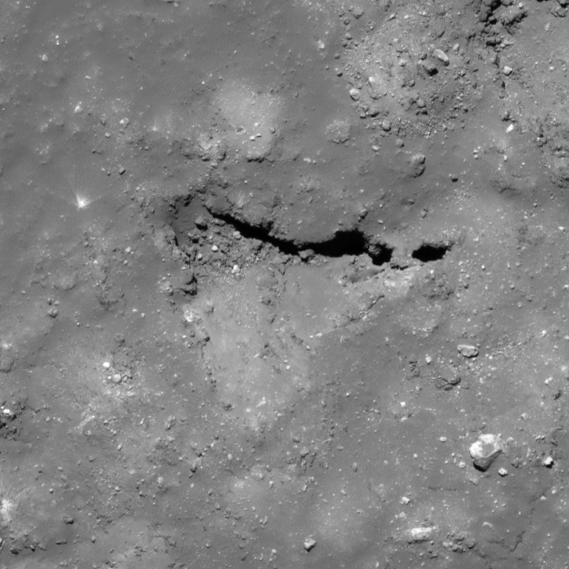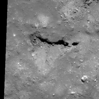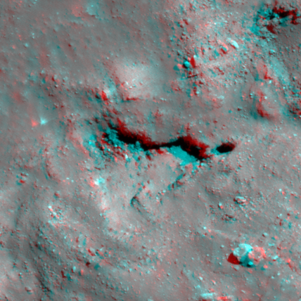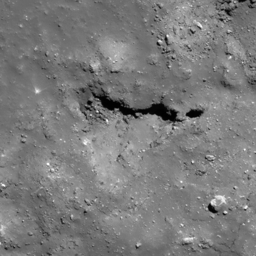 | Desc. | Large, shallow, roughly triangular pit at the base of a PRF. S wall is mostly a slope down from rim (in places near the top of the PRF) to the floor, but there is usually a bit of a vertical wall at the top. There is a small pit (Near Pavlov G 1b) adjacent on the E side, close enough that there may be a bridge. No available Sun angle confirms a connection, though. There is another pair of much smaller and shallower collapses ~280m north. |