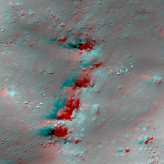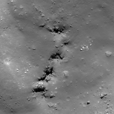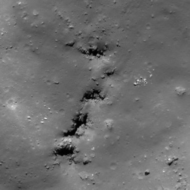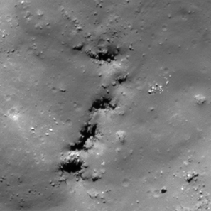 | Desc. | Triangular pit at northern end of a 100m chain of collapses at the edge of a hill. Floor is sloped from N to S, and shadow measures are to N end of floor. Tycho 15b is the center pit, and the southernmost collapse is more an alcove in the hillside level with the surrounding terrain (with an ~8m high N wall). The ground appears slightly sagged between the pits in the chain. There are several other linear depressions running in the same direction in the area. |