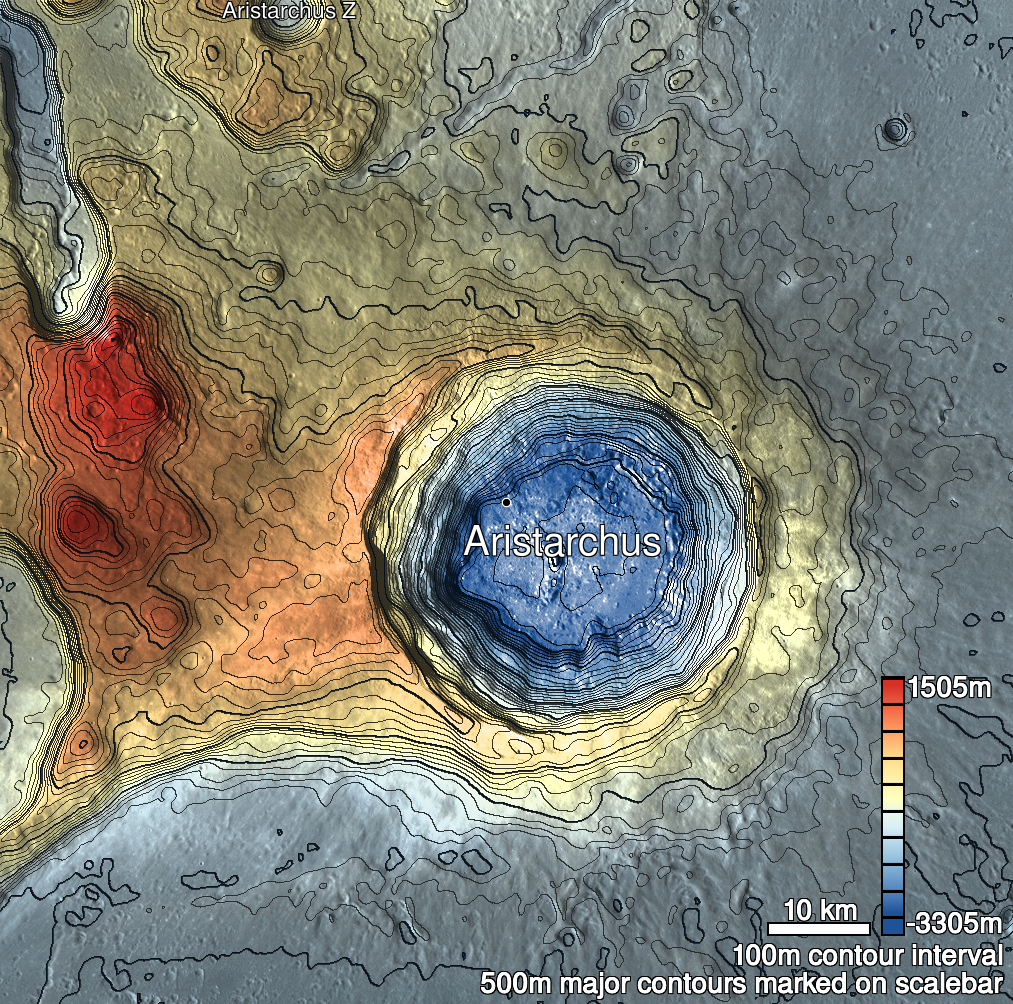 | Desc. | Irregular pit. South wall has a shelf/boulder sticking out part-way down, which interferes with shadow measurements. There is some texturing on the floor that implies ~0.5-2m boulders. ~300m SSE of Aristarchus 2c, and there is another pit-like depression another ~300m SSE. |