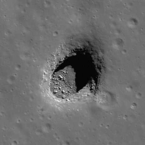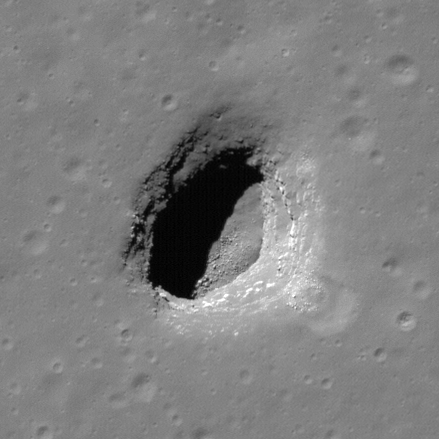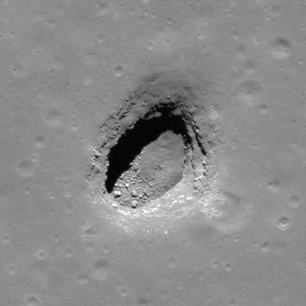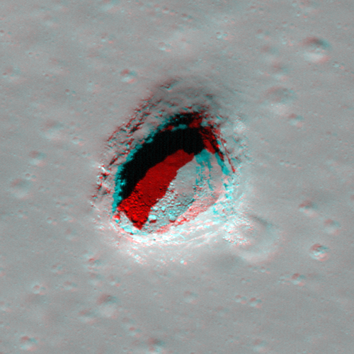| Desc. | Elliptical pit with a very pronounced funnel exposing numerous coherent layers. There is a ~40m diameter crater on the wider E edge of the funnel, which may have triggered some expansion of the funnel on that side. The floor is higher on the E side than the W, and slopes down from N to S. Depth from rim to floor ranges from 15-65 m, and the funnel is ~40m deep on the E side (~20-30 on the W). There is an overhang of at least 10-20 m on both the W and S sides. No unusual surface features in the area, although there is a 600m crater ~200m N of the pit. |