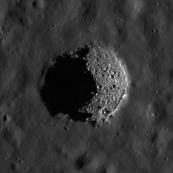 | Desc. | Elliptical pit with very rounded floor, and taller walls than most of the other Copernicus S_ pits (vertical walls are up to 35m high). This pit was previously identified as "Copernicus 15". Floor has numerous 5-20m boulders. Possible traversable slope at two points (NW rim and NNE rim), but paths may be blocked by boulders. Rim is mostly unbroken. There is a narrow slope down towards the rim on the SE side, reminiscent of a Type-I APC (Cushing et al. 2015), but slews do not reveal any openings above the current floor-level. |