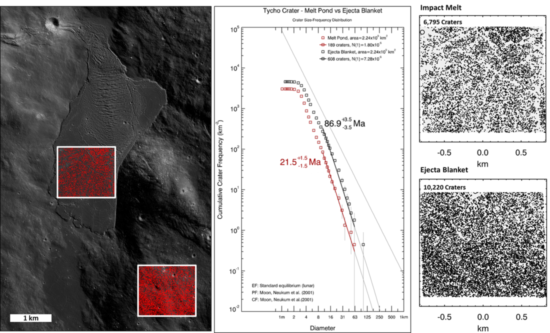 Since the impact melt flows would occur after the self-secondary impact craters formed, they would bury the self-secondary craters and become a "clean-slate" surface that would record only new impacts. This scenario is supported by images that show show buried “ghost” craters in large impact melt ponds at Tycho. These appear to indicate that self-secondary craters formed on Tycho's ejecta blanket close to Tycho, but were then flooded by the later-arriving impact melt.