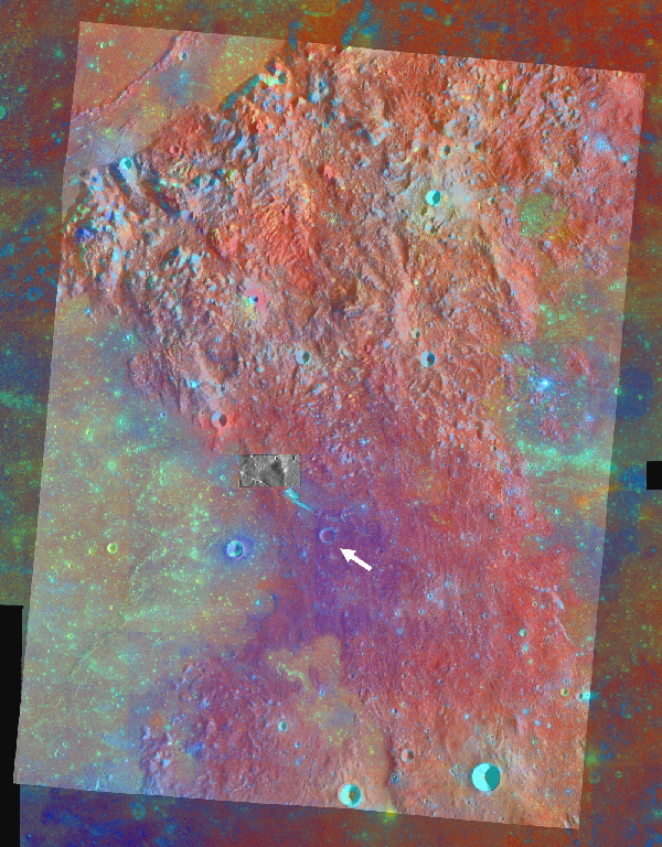 Coregistered Lunar Orbiter mosaic (LO-IV 109H2) and Clementine color-ratio (R=750/415, G=750/950, B=415/750) mosaics of the Rima Bode region of the Moon. The pyroclastic deposit at Rima Bode is the bluish purple unit that covers the highlands. The white arrows marks the location of the small crater shown in the portion of NAC frame M124593116L. Crater Bode A at lower right is 12 km in diameter. The projection is Simple Cylindrical, north is toward the top.