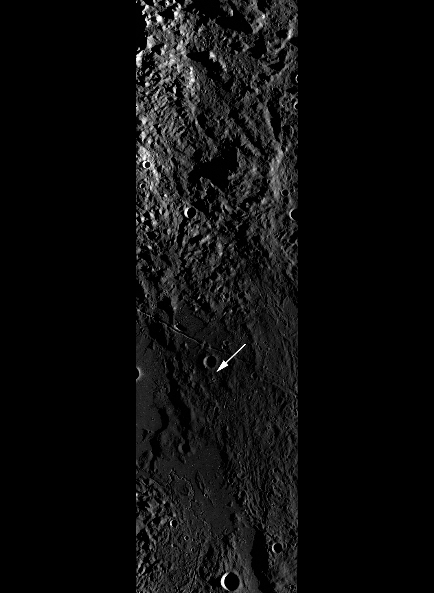 Uncontrolled LROC Wide Angle Camera monochrome context image showing the Rima Bode region and southern Montes Appeninus. Approximate position of today's LROC Featured Image is highlighted by a white arrow. Image width is 90 km [NASA/GSFC/Arizona State University].