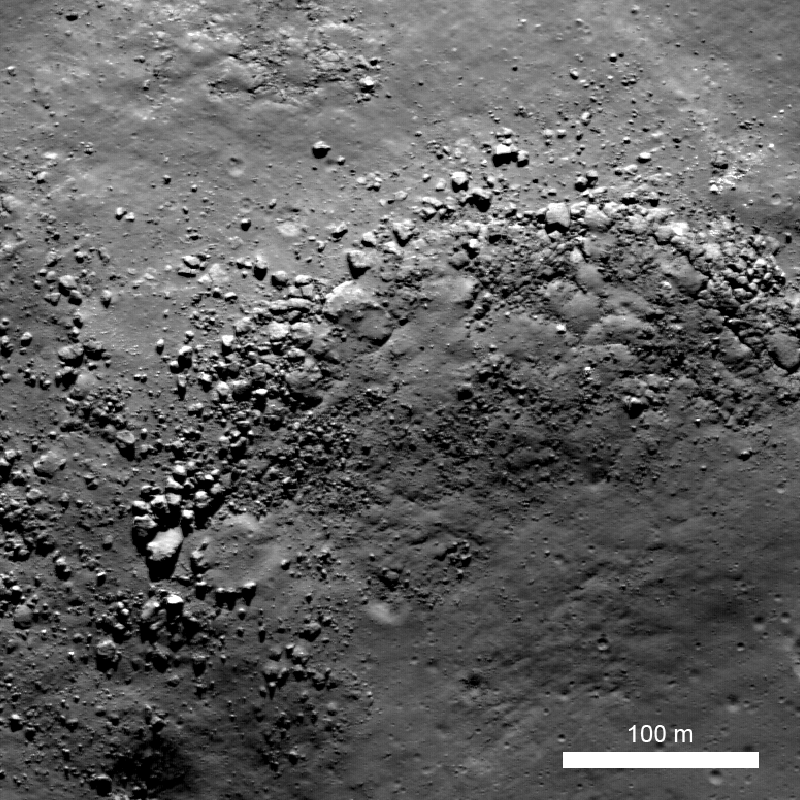 The rubbly boulders shown above may be the remnants of impact melt that temporarily washed over a high mound on the crater floor. As the melt hardened it formed a thin, brittle shell that was later broken by quakes or small impacts. Look closely at the picture and see if there is any evidence to support this hypothesis.