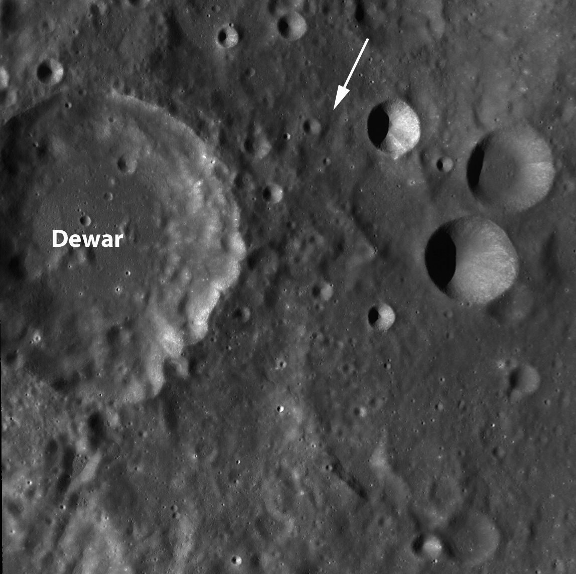 This area is the heart of the Dewar geochemical anomaly, one of only a handful of mare deposits on the far side of the Moon. Unlike many mare basalts, such as those that fill Mare Moscoviense, the Dewar deposit is not associated with a giant impact basin, but is instead an ancient and mostly buried mare deposit known as a "cryptomare." Apollo-era imaging of this location was extremely limited; although this region was visible as low-reflectance material in Lunar Orbiter images, the mare deposit was not definitively identified as such until 2008. This discovery came from detailed analysis of multispectral images from Clementine and geochemical information returned by the Lunar Prospector spacecraft. Results from these two missions revealed that the low-reflectance materials are spectrally similar to nearside mare basalts, have elevated levels of iron and titanium, and are enriched in the element thorium. So although the Dewar materials are geochemically anomalous in the context of the lunar farside highlands, they are surprisingly similar to nearside basalts. The small craters that you see in today's Featured Image have excavated material from within the mare deposit. Astronauts visiting craters such as these would be able to unravel clues to the stratigraphy and age of the Dewar basalts.
