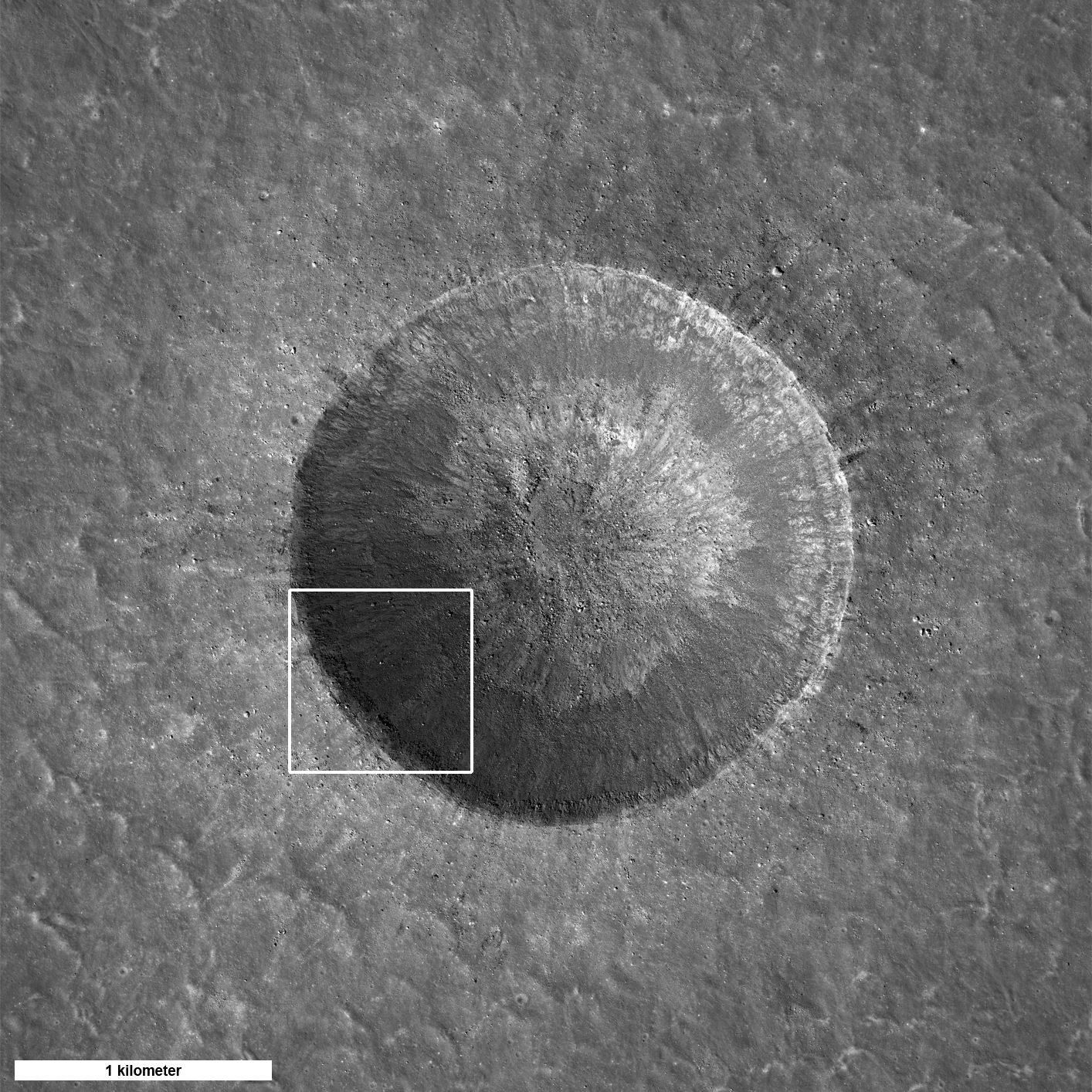 Reduced resolution (3 meter pixel scale) mosaic of Linne crater. White box shows location of full resolution opening image [NASA/GSFC/Arizona State University].