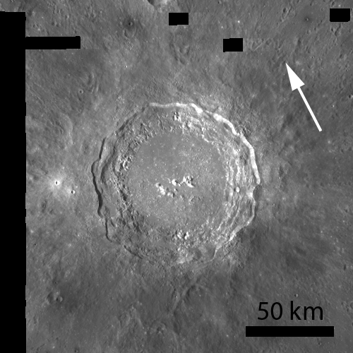 LROC Wide Angle Camera 400 m/pixel monochrome mosaic of Copernicus crater (93 km diameter). The arrow indicates the approximate position of the NAC image above [NASA/GSFC/Arizona State University].