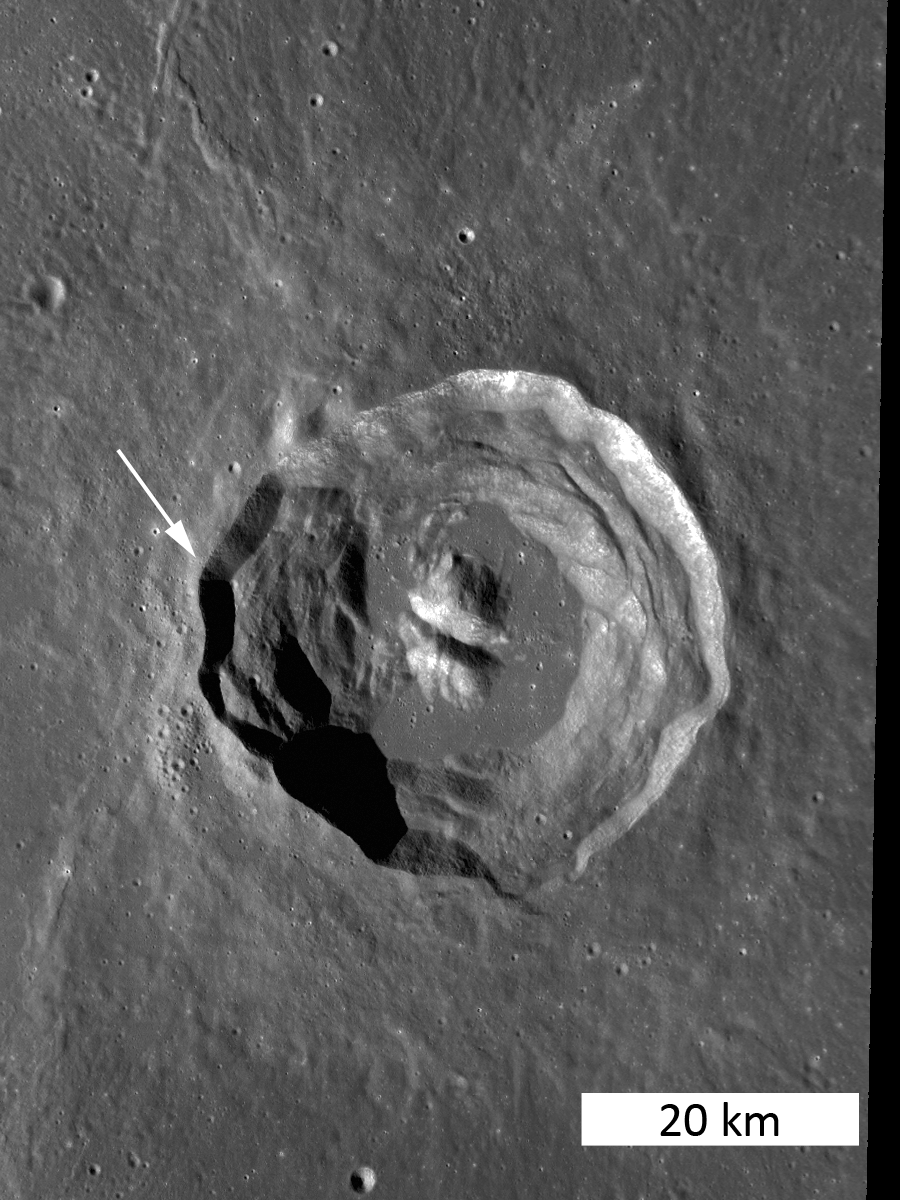 Bürg crater is unique from many other complex craters because instead of having a broadly circular rim, the crater's rim is scalloped and wavy. Sometimes, pre-existing geologic structures or features help shape a crater during crater formation. Meteor Crater on Earth has a slightly polygonal shape because of the joints and fractures that pervade the target sedimentary rocks. Could pre-existing joints in the mare basalts filling Lacus Mortis explain the scalloped nature of Bürg's rim? Possibly, but because the overall shape of the crater itself is circular and resembles other complex craters on the Moon, structural influences may have only affected portions of the crater rim, causing differential collapse and terrace formation. Looking closely at the portion of the LROC WAC image above, there seems to be greater terracing and wall-slumping on the western side of the crater, which also happens to be less circular than the eastern rim. However, before we use this observation to interpret the origin for the scalloped crater rim, we need to look at additional LROC NAC images and the LROC WAC image in detail to substantiate this hypothesis.