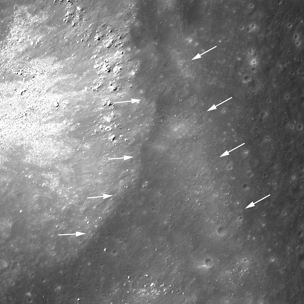 Cross-cutting relations between Rupes Recta and an impact crater are evident in this subset of LROC NAC image M12264663R. The cliff-face of Rupes Recta is noted by the arrows on the right side of the image. At some point after the formation of Rupes Recta, an impact occurred and excavated material from the fault wall. The arrows on the left side of the image (forming a somewhat-curvilinear path) denote the crater wall. Subsequent down-slope movement of eroded debris and blocks is visible. Image width is 840 m, illumination from the left, and the low-incidence angle of this image highlights the albedo variations [NASA/GSFC/Arizona State University].