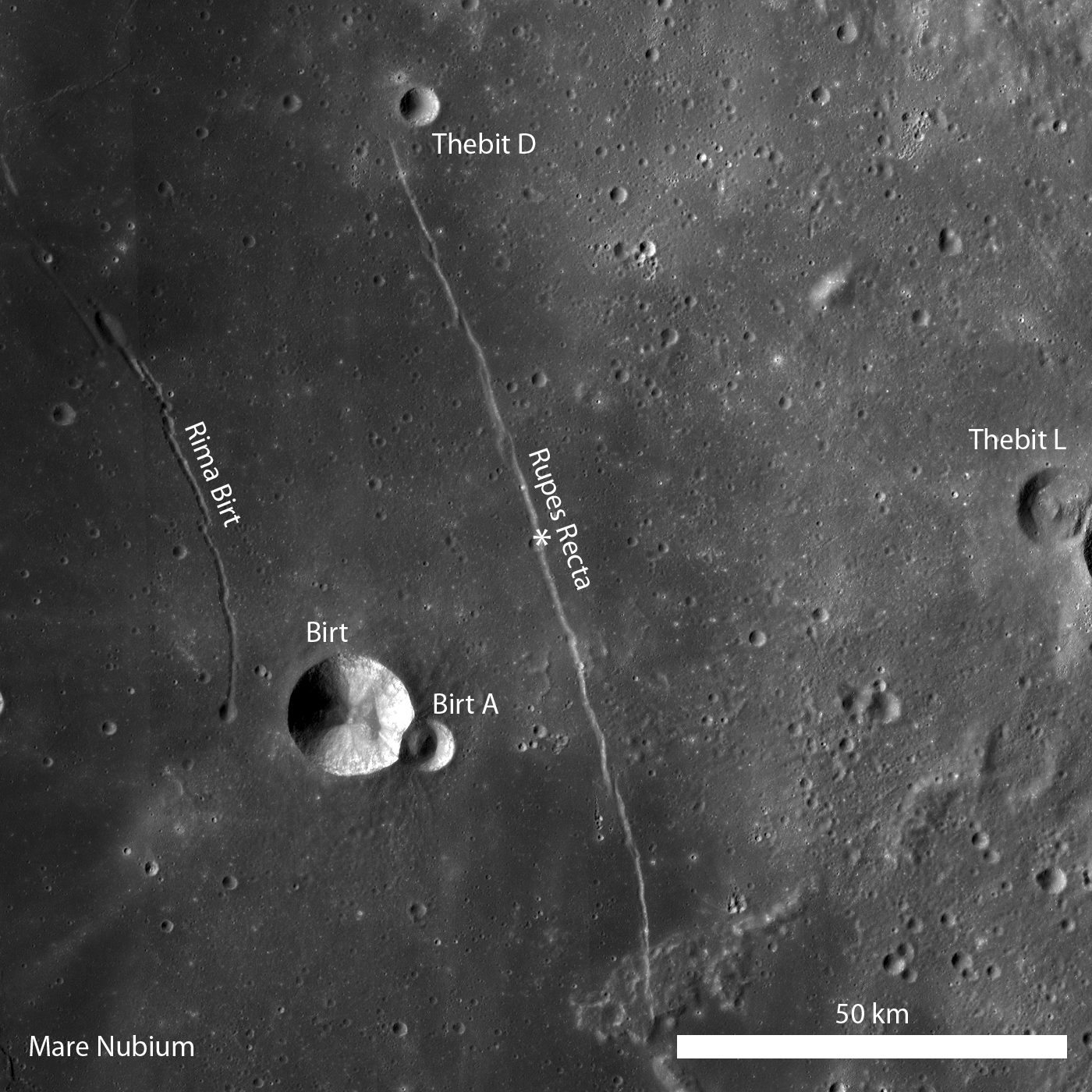 Several weeks ago LROC featured a series of WAC monochrome mosaics of some of the most spectacular sinuous rilles on the Moon (Rimae Posidonius, Vallis Schröteri, and Rimae Prinz). Unlike sinuous rilles, linear rilles (or graben) are not believed to primarily result from lunar volcanism. Linear rilles are surface manifestations of structural faulting that formed when the lunar crust was pulled apart. The widths of these linear rilles range from as little as a few meters to kilometers across; Rupes Recta is between 1 - 3 km wide across its length. In addition, Rupes Recta is composed of several en echelon segments - the linear rille is not a single, uninterrupted 100 km length fault! There are at least 5 large fault segments visible at the LROC WAC scale (100 m/pixel) that range from ~8 km to 50 km in length.