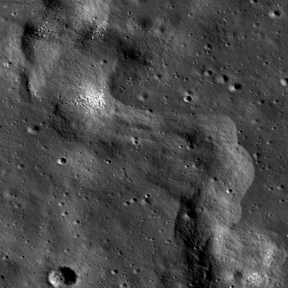 Karrer crater (52.13°S, 142.31°W) is mare-filled crater on the far side of the Moon, approximately 51 km in diameter. Karrer is special because there are fewer mare basalt surfaces on the far side compared to the near side of the Moon. Within Karrer crater's mare basalt covered floor is a lobate scarp, unofficially designated as Karrer scarp for the crater within which it is located. Today's image shows a section of this scarp, where the deformation of the mare basalt is close to forming the shape of two right angles. Mare basalt surfaces often have lobate scarps and wrinkle ridges, two types of contractional tectonic features. In the WAC monochrome mosaic (below), you can see that the scarp extends south outside the rim of Karrer crater onto highlands material. Lobate scarps are thought to be the surface expression of thrust faults, formed when an upper fault block is pushed up and over a lower fault block.