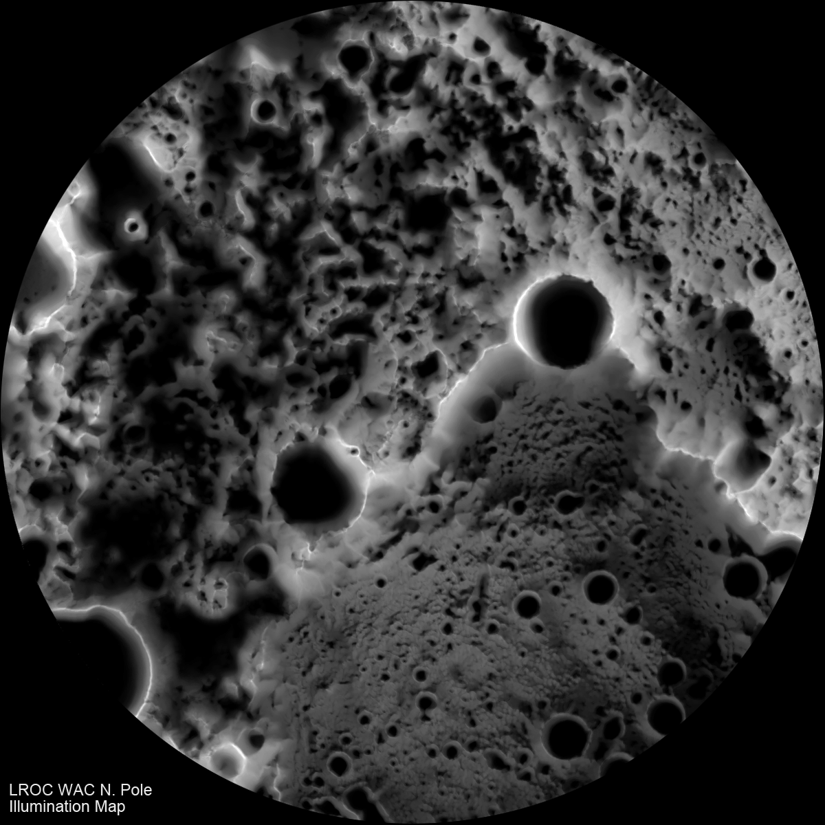 One of the primary scientific objectives of the Lunar Reconnaissance Orbiter Camera (LROC) is to identify regions of permanent shadow and near-permanent illumination. Since the start of the nominal mission, LROC has acquired thousands of Wide Angle Camera (WAC) images approaching the north pole. From these images we produced two very different types of mosaics. The more conventional mosaic is shown above and is composed of 983 images taken over a one month period during northern summer. This mosaic shows the pole when it is best illuminated, regions that are in shadow are candidates for permanent shadow. The best way to determine lighting conditions with image data is to take many pictures over a year and stack them up. From orbit-to-orbit, the WAC frames overlap from about 88°N to the pole. At each point you count how often that pixel is illuminated and create a percentage illumination map. You can also think of this mosaic as a multi-temporal mosaic.