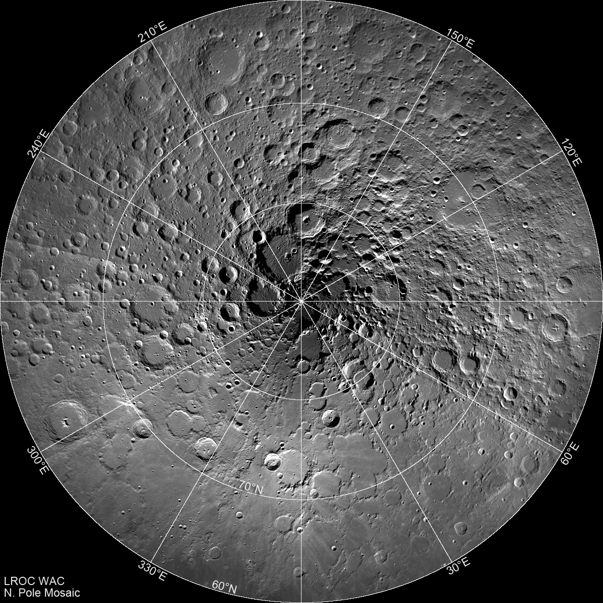 LROC Wide Angle Camera mosaic of the Moon's north pole; polar stereographic projection, 60°N to 90°N [NASA/GSFC/Arizona State University].