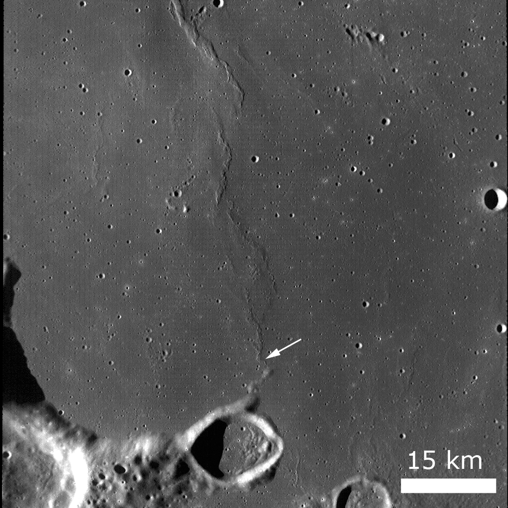 The sinuous wrinkle ridge above is a small part of a larger wrinkle ridge, which in turn is part of a larger wrinkle ridge network located in southwestern Oceanus Procellarum. Wrinkle ridges are tectonic features resulting from compressive stresses and are of particular interest to scientists. The wrinkle ridge featured today has a well-defined broad rise (or ridge) with numerous superposed wrinkles. In addition, boulders litter the crest of the ridge in some places, and most likely they eroded out of the fractured and faulted basalt forming the wrinkle ridge. However, when looking at the full LROC NAC image, there are only a few places along the wrinkle ridge where boulders are observed. No one really seems to know why boulders are present on some ridges but not others - a question lunar scientists are attempting to answer using LROC NAC data!