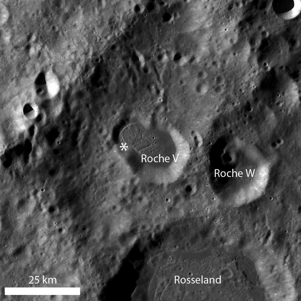 Roche V (38.86°S, 129.62°E) is one of five satellite craters associated with Roche crater. Compared to its siblings, Roche V is the ugly duckling of the bunch: it has an oblong, irregular shape, floor fractures, and mare fill. But, similar to the ugly duckling in the story, the geologic features that stand out and catch our attention make this 29 km diameter crater quite special indeed. The irregular shape tells us something about the crater formation, probably because the impactor hit the lunar surface at a highly oblique angle. But maybe more exciting is the flooded mare material in the crater, along with both linear and arcuate fractures. There are many floor fractured craters on the Moon, but most of them are much larger than Roche V (for example, Gassendi is 110 km in diameter). The cause of fractures in these larger craters remains poorly understood, but scientists do know that the floors of these craters are uplifted and many contain smooth deposits of basalt. Given the size difference between Roche V and these larger craters, can we explain the geology of the Roche V crater floor?