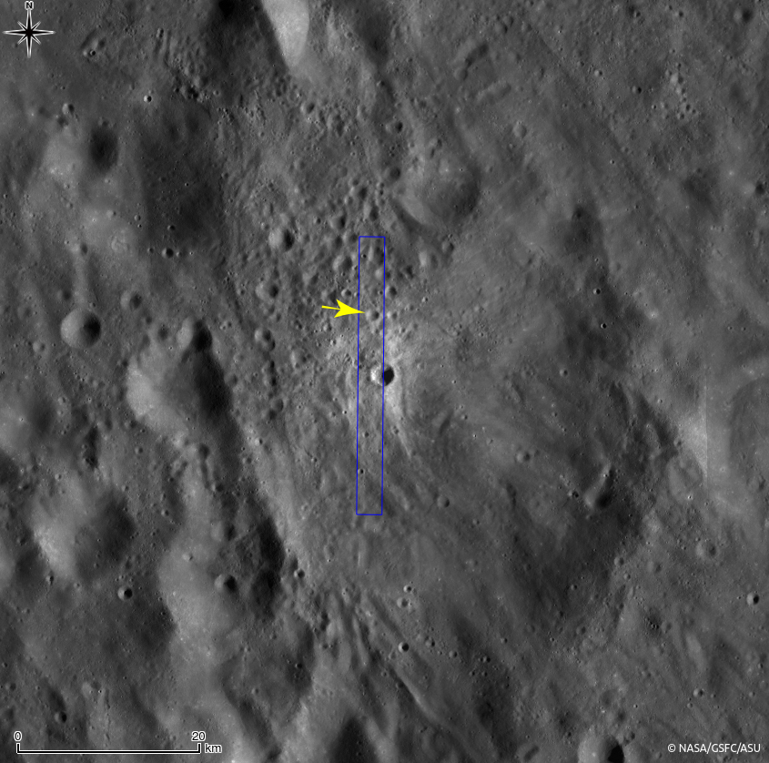 As seen in this second image, the flow direction of ejecta curved along a bowl shaped topographic low (probably a degraded old crater). These characteristic flow lines following the local topography allows scientists to estimate the actual flow speed. In turn, these estimates elucidate detailed mechanisms of ejecta emplacement on the Moon and by comparison other airless bodies, such as asteroids and the planet Mercury.