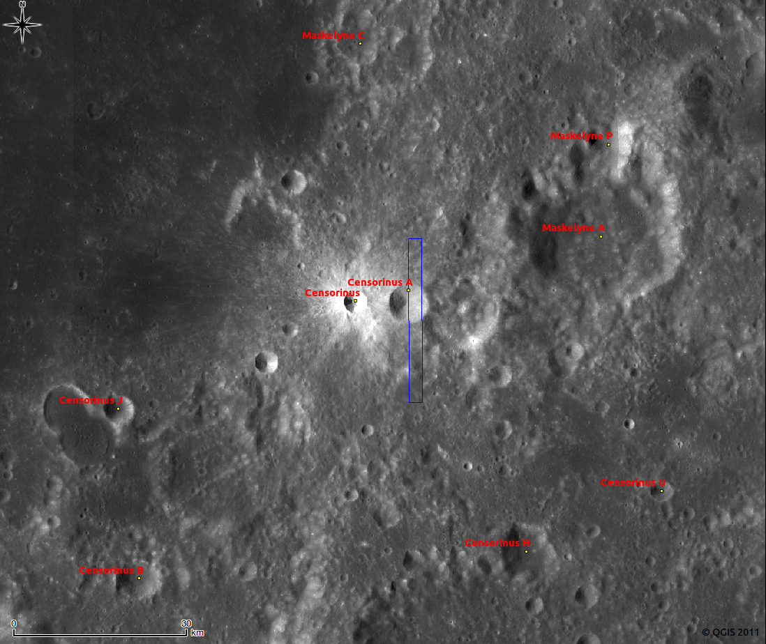 LROC WAC 100m/pixel mosaic near Censorinus crater. Image center is latitude 0.41°S, longitude 32.97°E. Blue box corresponds to NAC full frame footprint [NASA/GSFC/Arizona State University].