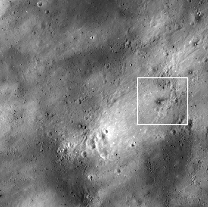 Ejecta blanket at north of Censorinus A crater. Image width is about 1.2 km. While box indicates the area of today's Featured Image [NASA/GSFC/Arizona State University].