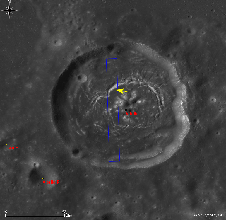 Vitello crater is a floor-fractured crater (42.5 km in diameter), located at the south edge of Mare Humorum. As seen in the WAC context image, there is a circular network of fractures with numerous branches in the crater floor. The opening image highlights a portion of north facing slopes inside one of these fractures (yellow arrow).