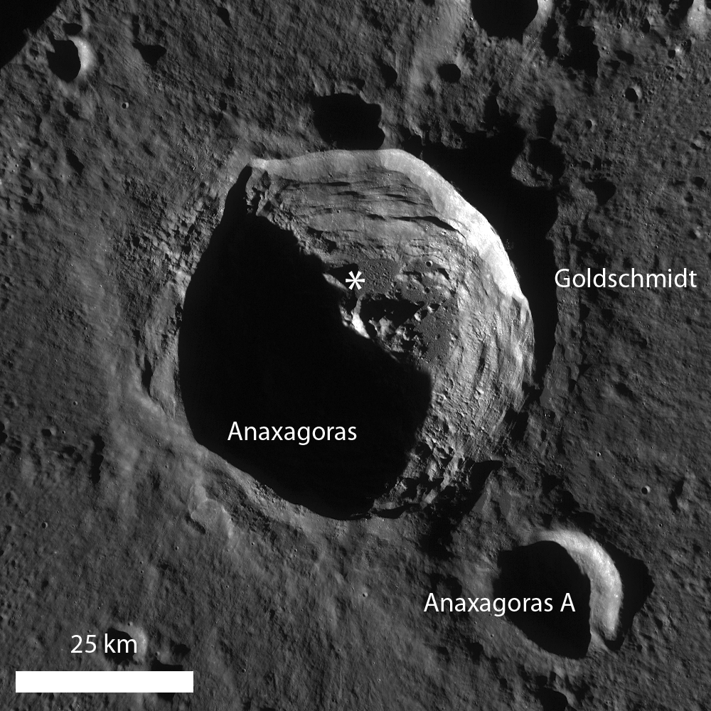 Anaxagoras, 50 km diameter, is a Copernican-aged crater located on the lunar far side. A previous post examined exposed bedrock in its central peak and mentioned the impact melt-covered floor. Impact melts are exciting to lunar geologists not just because the melt ponds and flows are beautiful, but because samples of impact melts can provide a specific and accurate age of crater formation through radiometric dating.