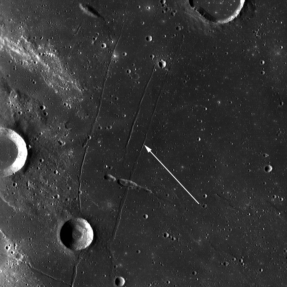 Linear rilles are so named because of their nearly-straight morphology and surface expression. Unlike sinuous rilles, which are volcanic, linear rilles are tectonic in nature. Similar features on Earth are termed graben, and are created when two normal faults border a block of rock which has been depressed, producing a valley. Since normal faults are understood to be the products of extensional stresses (see yesterday's Featured Image post), we can assume this region of the Moon was "pulled apart" - creating these normal faults, dropping the middle blocks, and producing the linear rilles. So a linear rille is the lunar analog of a graben on Earth!