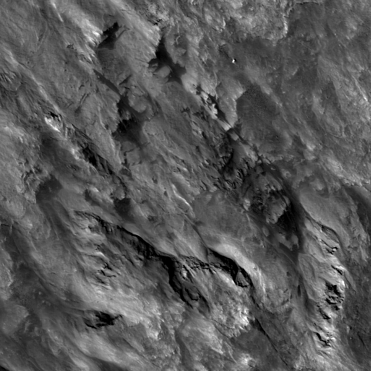 The southeastern crater wall near the crater rim (below) is markedly different than the northeastern part of the crater wall nearing the crater floor (opening image). Instead of well-developed low-reflectance debris flows tendrils located downhill from the crater rim because of gravity, there is a mix of both high- and low-reflectance material on the crater wall slope. There are also large erosional troughs or alcoves from which the material forming debris flows originates. The contrast between reflectance of the crater wall and the lower-reflectance material traveling downslope (to the upper left) illustrates that the crater wall is not a smooth, flat surface. Small slope breaks in the crater wall acted as a dam to halt debris on their downward descent to the crater floor. Maybe these troughs will erode to the point where, in several millions of years, substantial material from the upper part of the southeastern wall will have mobilized downhill to form debris flows similar to those on the northeastern slope.