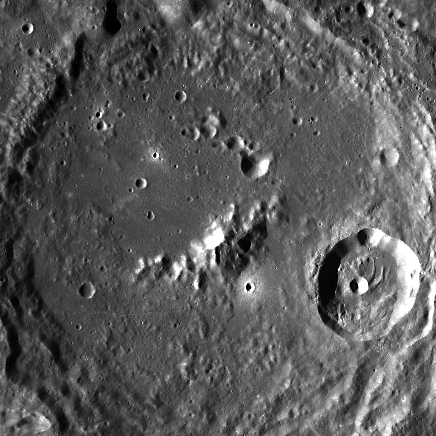 Impact crater ejecta is usually distributed semi-uniformly around an impact crater. Immature ejecta from a fresh crater has a higher albedo than the mature material on the surrounding surface, and so fresh craters easily stand out against the mature background. So why do the smaller craters in today's Featured Image have a lower albedo? On the Moon this is often due to a cryptomare located underneath the bright ejecta blanket. Taking a step back and looking at this area in the WAC context image gives us a better idea of how to interpret this scene.