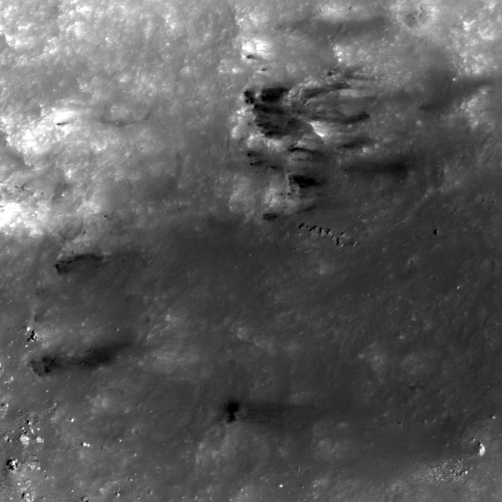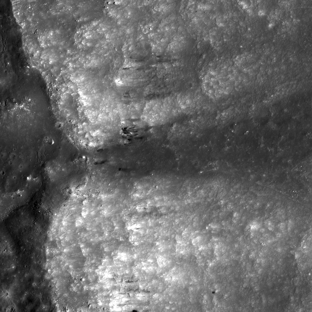 A wider view of NAC image M11735067L shows the association of a promontory's location with the occurrence of the dark deposits. Image is ~2.2 km across, downsampled from 50 cm/pixel to ~2.3 m/pixel [NASA/GSFC/Arizona State University].