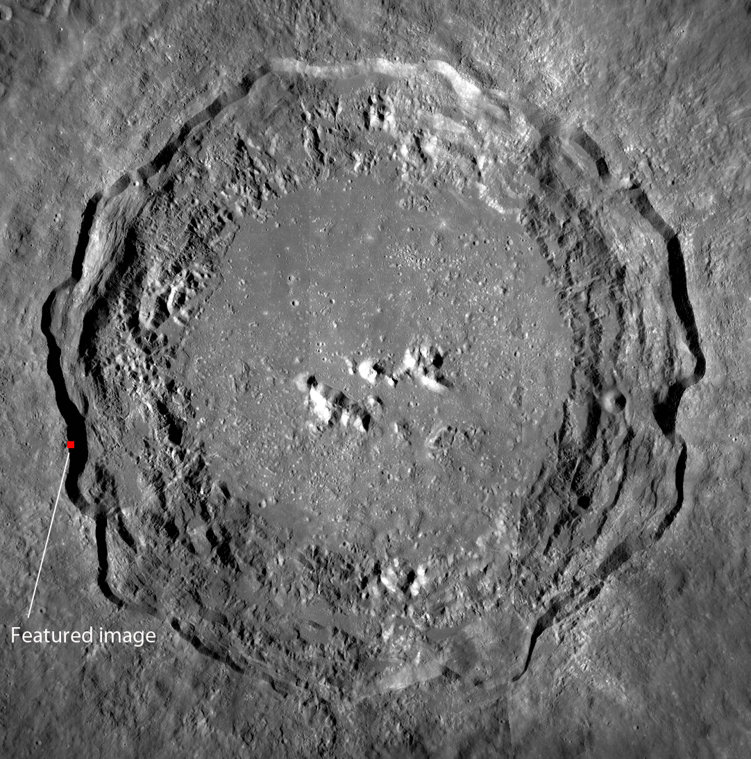 The context image below provides a sense for how steep the outermost walls of Copernicus crater are, and show the location of today's Featured Image.