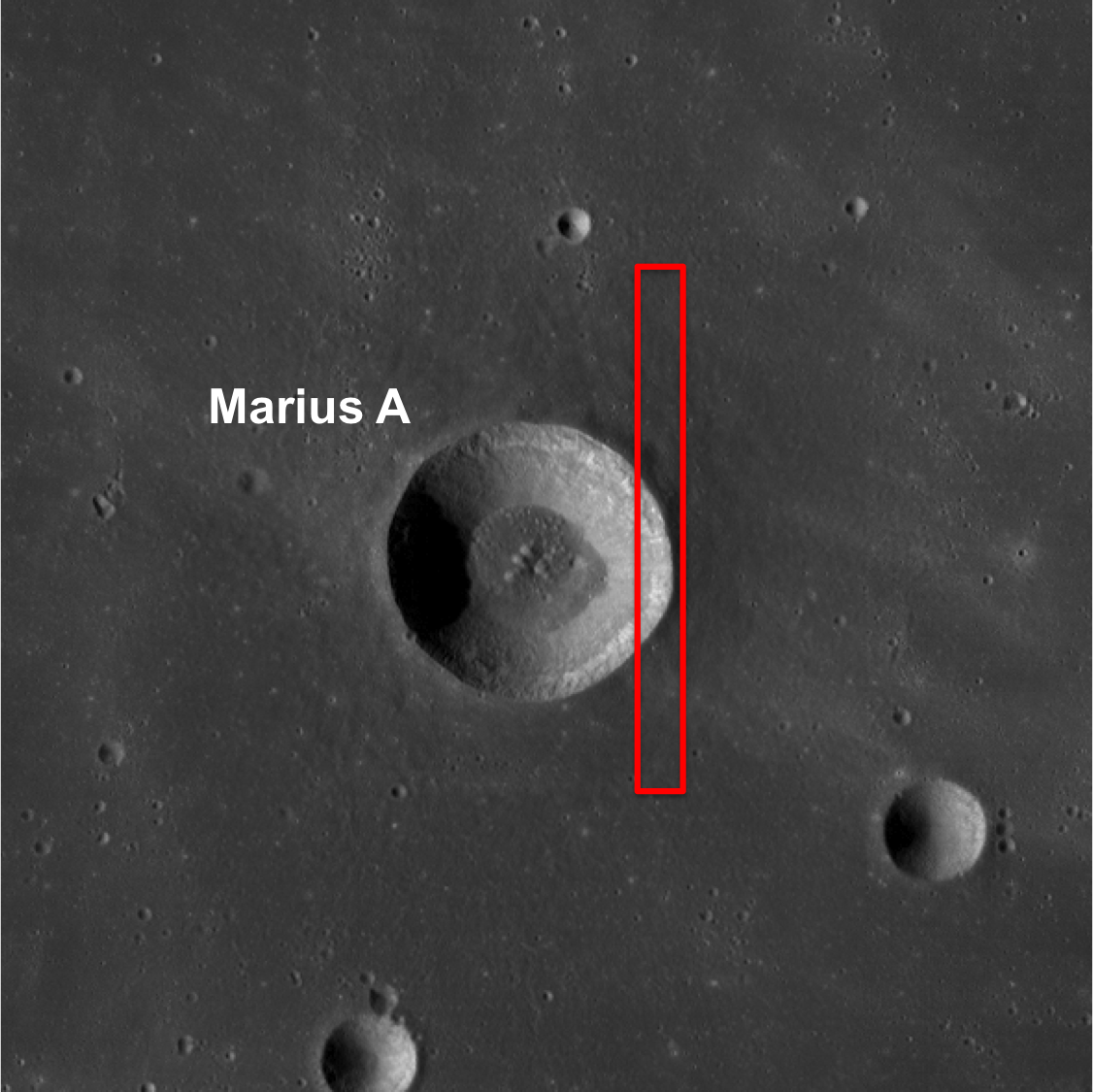 Marius A is an ~15 km diameter crater (12.58°N, 46.05°W) located within Mare Insularum. The Featured Image shows basalt layering partially covered by streaks of granular material that slid down from higher up on the wall. Craters with visible basalt layers like Marius A are windows to the history of basalt deposition. Each thin layer seen in the wall of Marius A is probably a single flow or flow lobe, each spreading out across the lunar surface due to the low viscosity of mare basalt (basalt has a viscosity similar to that of ketchup). How much time passed between each layer is still an unanswered question. By studying many craters with visible basalt flows, however, scientists may be able to piece together a more detailed, local history for the various mare on the lunar surface. Not all craters in the mare have visible mare basalt layering, though. Additionally, over time post-impact processes like the debris in today's Featured Image and slumping of the crater walls reduce the visibility of basalt layers.