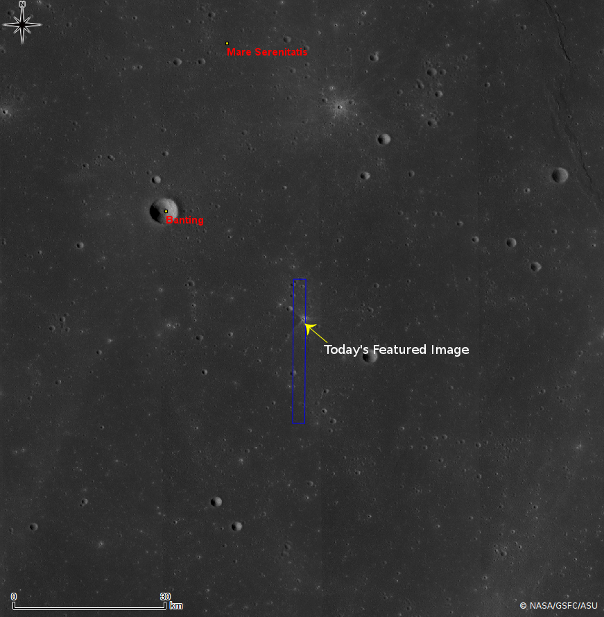 Today's Featured Image highlights the western half of an unnamed crater located in the middle of Mare Serenitatis. The crater diameter is about 470 meters. As seen in the second picture (a zoom-out of the same NAC frame), one third of the ejecta blanket (the western portion) is missing, probably due to an oblique impact from west to east. In the top image (near the crater center), almost all of the boulders are ejected in the northwest and southwest direction. The fine particles, however, extend out to the west in patterns not unlike a delicate lace. Studying the full variety of craters with distinctive ejecta patterns is key to understanding the dynamics of oblique impact events.