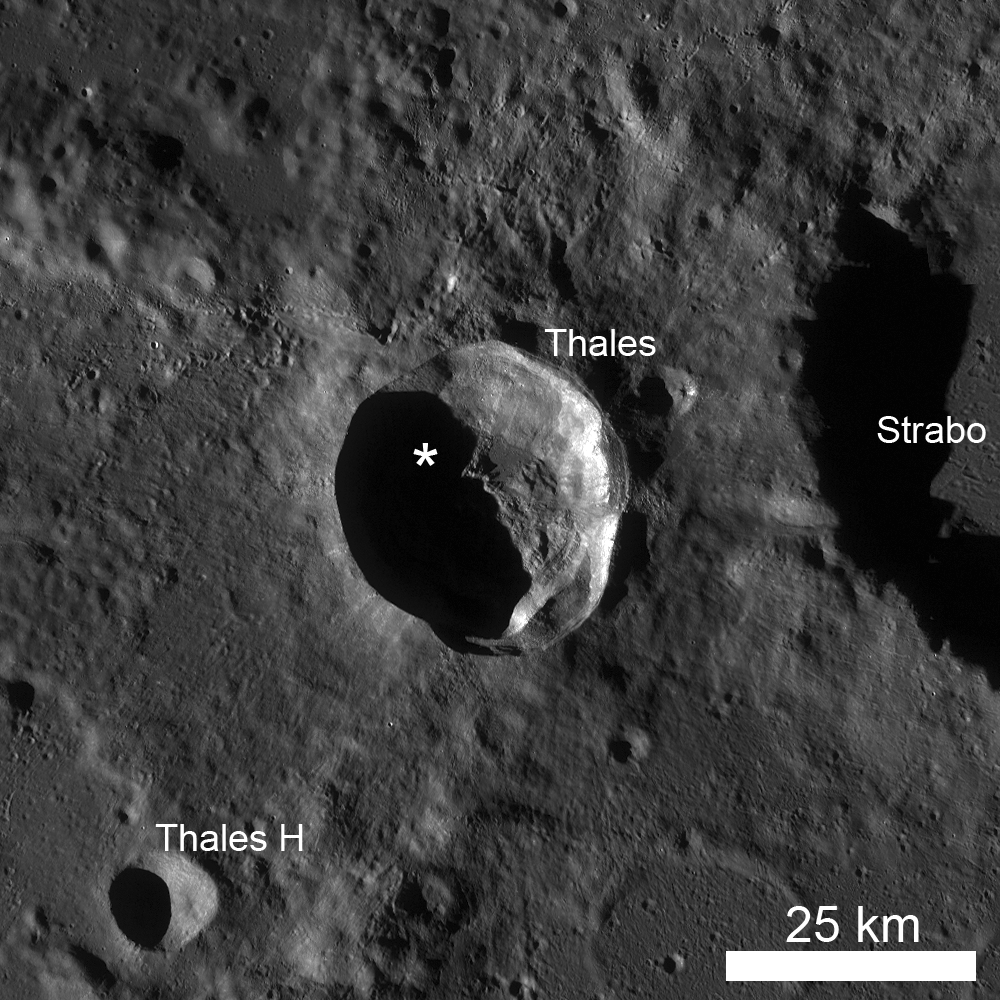 Many Copernican- and Eratosthenian-aged craters have substantial impact melt deposits within and surrounding them. Like so many other craters on the Moon, Thales crater (61.732°N, 50.284°E, ~31 km diameter) is remarkable in the diversity of geologic features observed in LROC NAC and WAC images. In the opening image, channelized impact melt flowed toward the crater floor from high up on the crater wall. The contact at which crater floor and wall meet is less distinct, but the change from channelized impact melt to fractured impact melt is representative of this boundary. Tomorrow's Featured Image will explore why impact melt may fracture a specific way, but suffice to say, the morphology of the impact melt in today's Featured Image is spectacular!