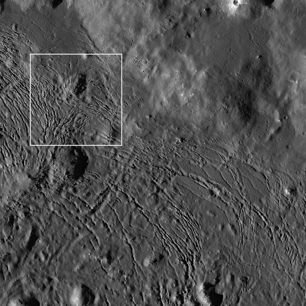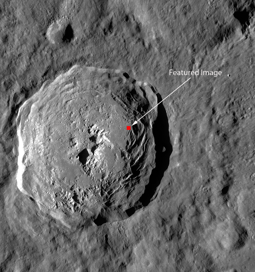 The extent and complexity of the melt pond features can be explored in the full NAC frame below. Additional examples of impact melt cracking include Polygonal fractures on Tycho ejecta deposits, fractured impact melt in Thales crater, and Moore F.