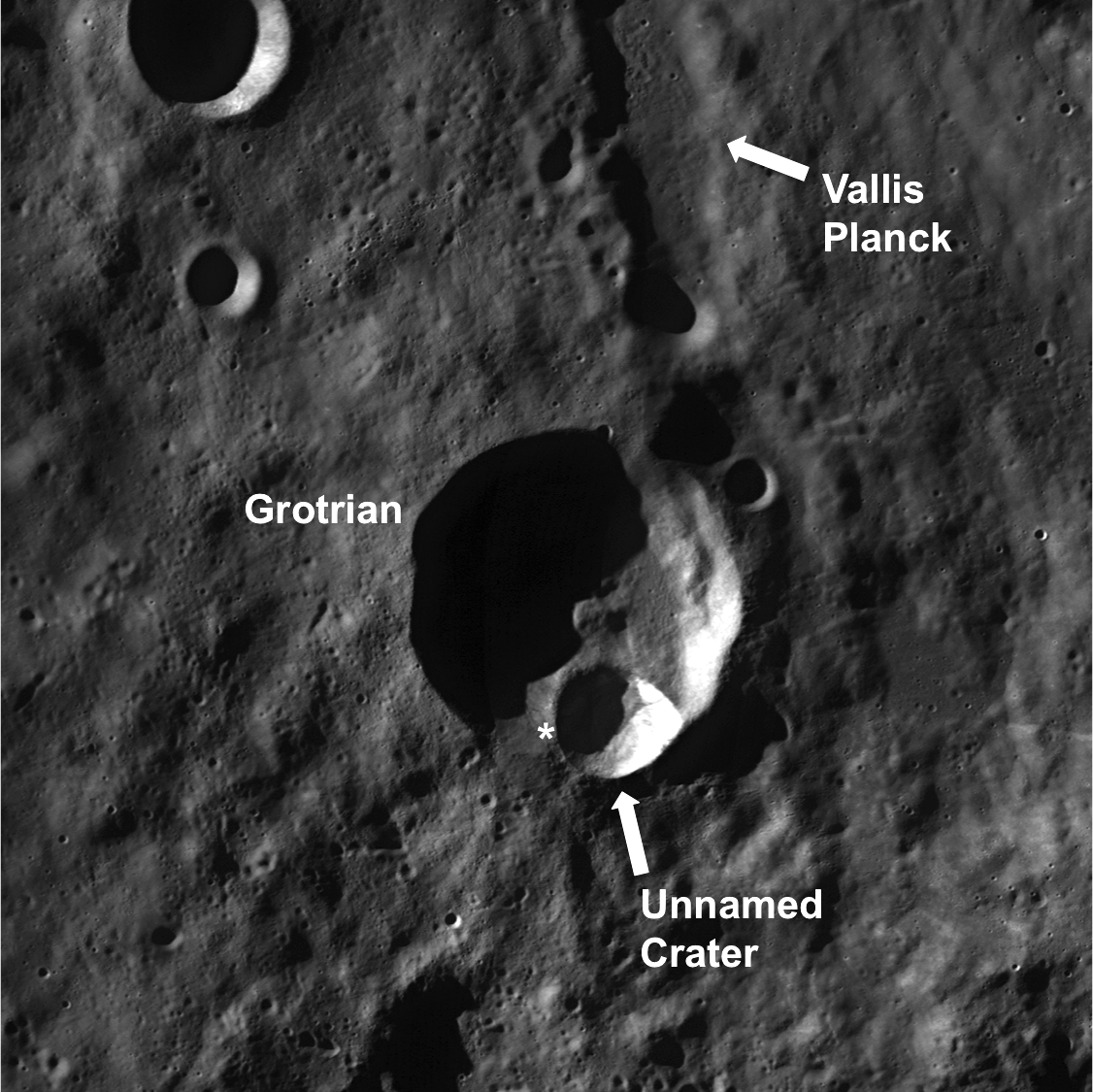 A boulder rests on the rim of an unnamed fresh crater, whose center is located at 66.615°S, 128.611°E. The boulder is partially covered in a layer of impact melt (dark smooth material). Small pieces of bare rock are visible in the impact melt as high reflectance dots in the relatively lower reflectance melt deposit. The boulder lies between fractured impact melt (outside the crater rim - left side of the image) and the interior rim of the crater (right side of the image). It appears that pieces of the main boulder broke off and tumbled down the interior crater wall leaving a trail of debris. Some of the impact melt deposit has also crumbled away and fallen towards the interior crater wall.