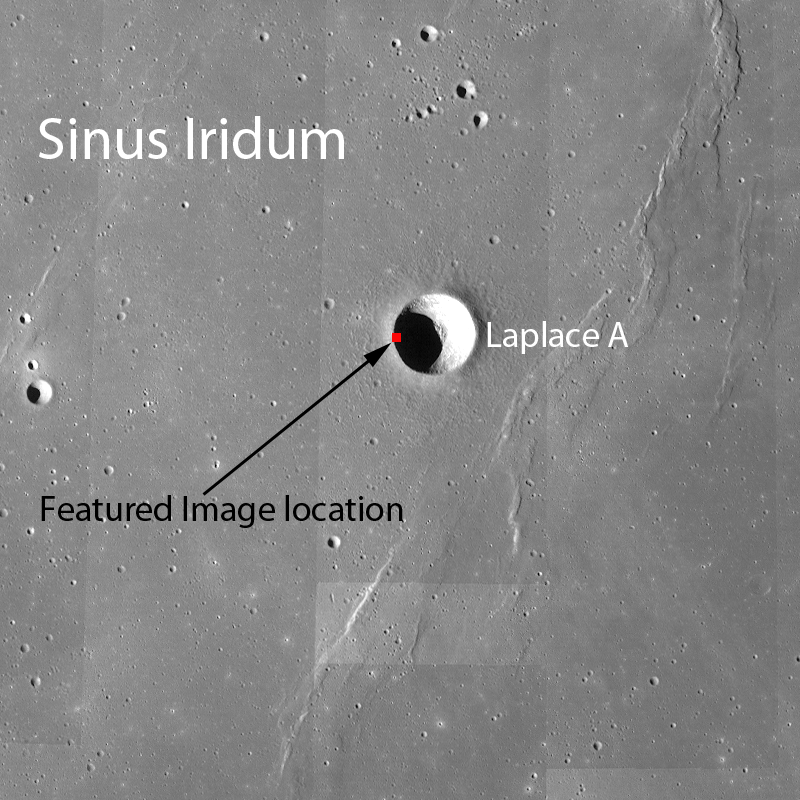Laplace A is an approximately 9 km-diameter impact feature in the mare where Sinus Iridum meets Mare Imbrium. If you have access to a small telescope, it is a challenging target for the eyepiece!