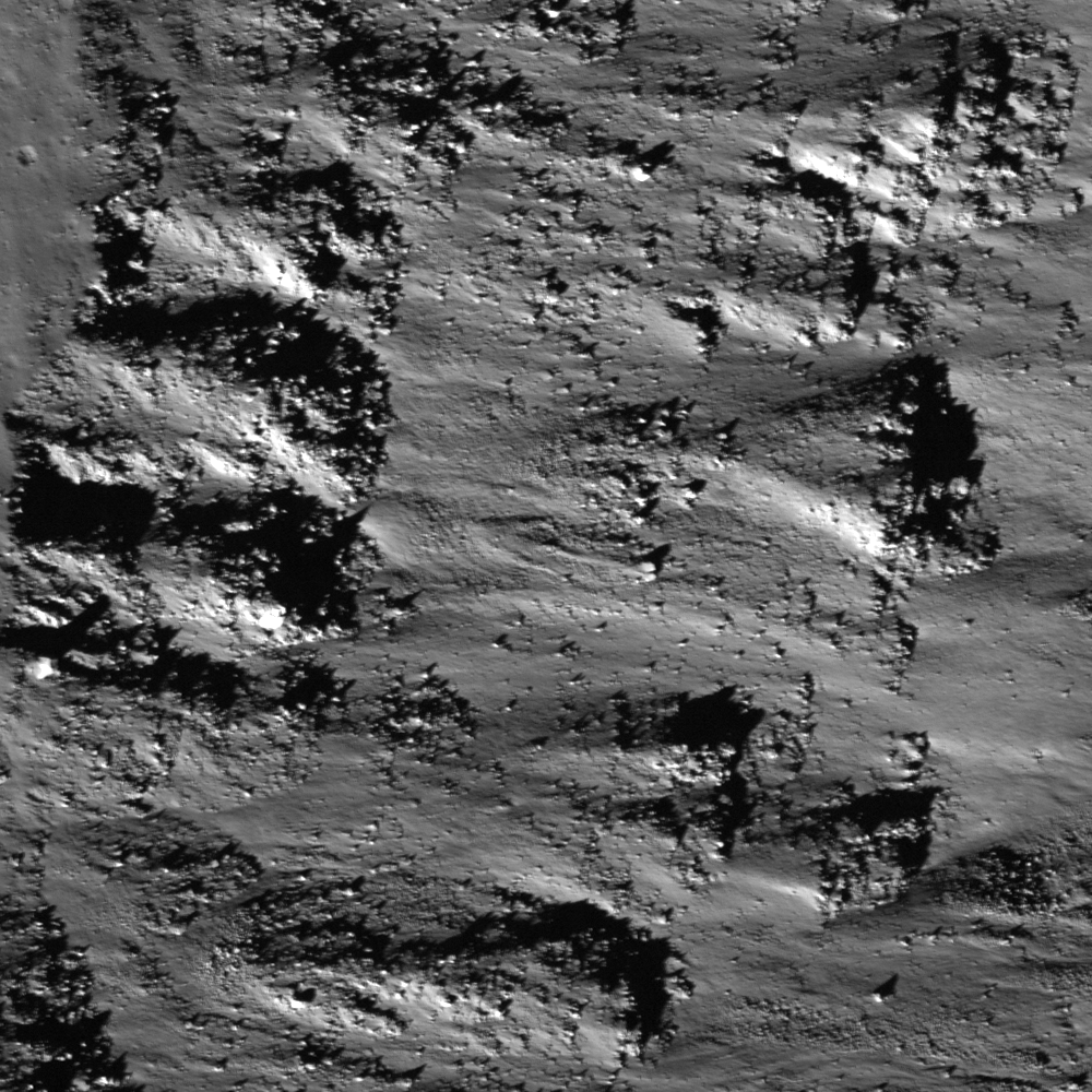 As with many mare deposit exposures when viewed at the Narrow Angle Camera imaging scale of 0.5 m/pixel, the bedrock outcrops in the walls of Laplace A appear as layered ledges. The layers are most noticeable in the north-northeast to south-southwest trending rocks visible in the northeast quadrant of the frame. Additional indications of layering can be found in the full NAC image (below). The prominent V-shaped outlines to some of the outcrops are suggestive of constructional deposition. Granular debris flows cascading down the crater walls following excavation appear to have encountered the obstructing ledges and "dammed up" behind them. Resistance to flow in such situations takes on a tapered shape in the direction of flow as the material becomes compacted. Minor occurrences of impact melt may be contributing to the smooth appearance of the flow deposits between the outcrops.