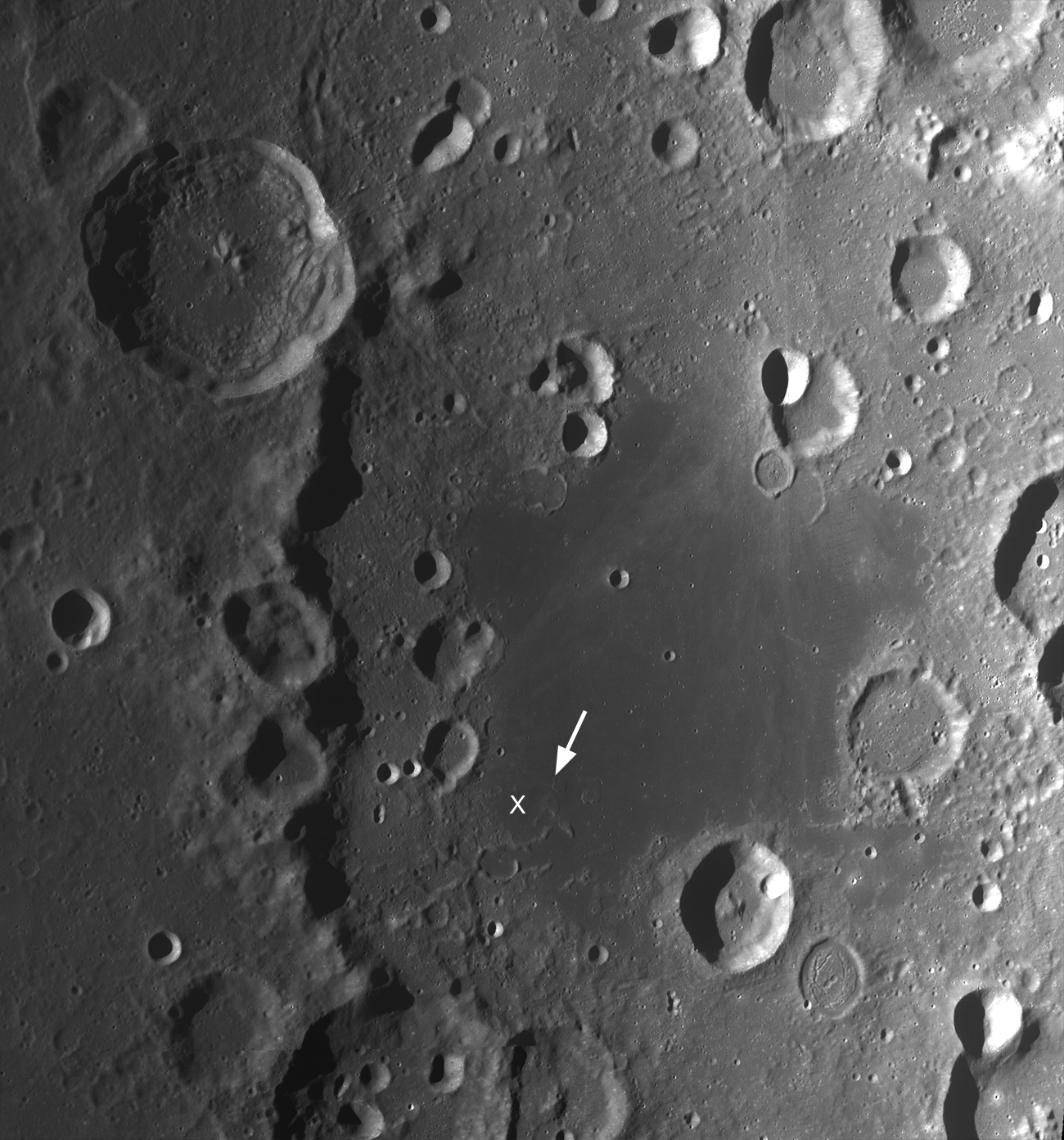 WAC mosaic showing most of Apollo Basin's northern, southern, and western inner ring as well as the central floor's dark mare basalt deposits. The white arrow shows the location of the high-resolution NAC image discussed above. The white "X", near the boundary of the smooth, dark floor deposits and the rougher, brighter inner ring highlands materials, is the center of one of the 50 Constellation Program regions of interest. The large (~51 km) crater at upper left is named Dryden; the largest (~49 km) crater partially visible just to the left of center at the bottom of the mosaic is called Chaffee.  North is up and the width of mosaic is 130 km [NASA/GSFC/Arizona State University].