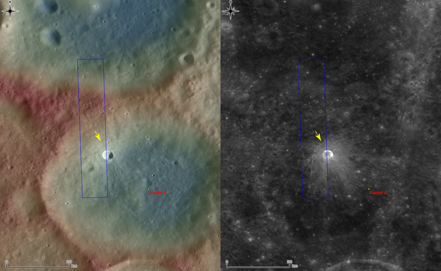 Dante C is a ~54 km diameter crater, located in the central farside highlands. In the northwestern portion of the crater floor, there is an unnamed crater (~3 km in diameter) with a spectacular diffuse asymmetric ejecta pattern (see next WAC no-shadow context view, right side).