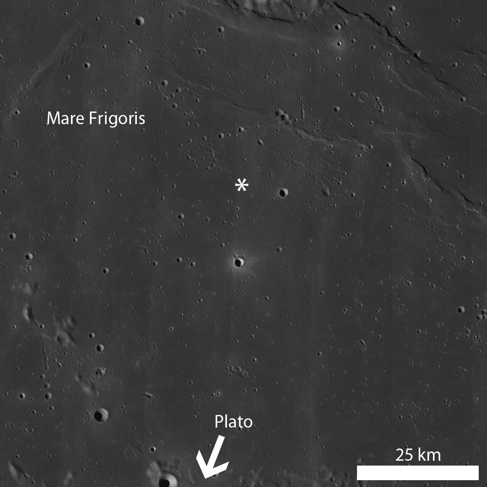 LROC WAC monochrome mosaic of the Mare Frigoris basalts. Asterisk notes location of opening image [NASA/GSFC/Arizona State University].
