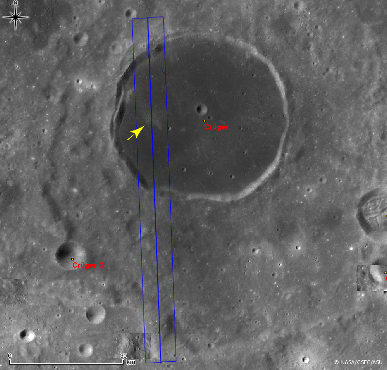 Crüger is a 45 km diameter crater located between Oceanus Procellarum and Orientale basin. The floor is completely covered in basaltic lava deposits, and is very flat. The western portion of the floor shows slightly high reflectance spots with clustered craters and disturbed surfaces, likely a field secondary craters. A unique feature of this grouping is the sharp topographic relief delimiting its southern boundary. The upper half of the opening image, the relatively disturbed and hummocky part, corresponds to the cluster area. Note that the sunlight is from the right side, and the cluster area is topographically lower than the southern relatively smooth area along the delimiting boundary.