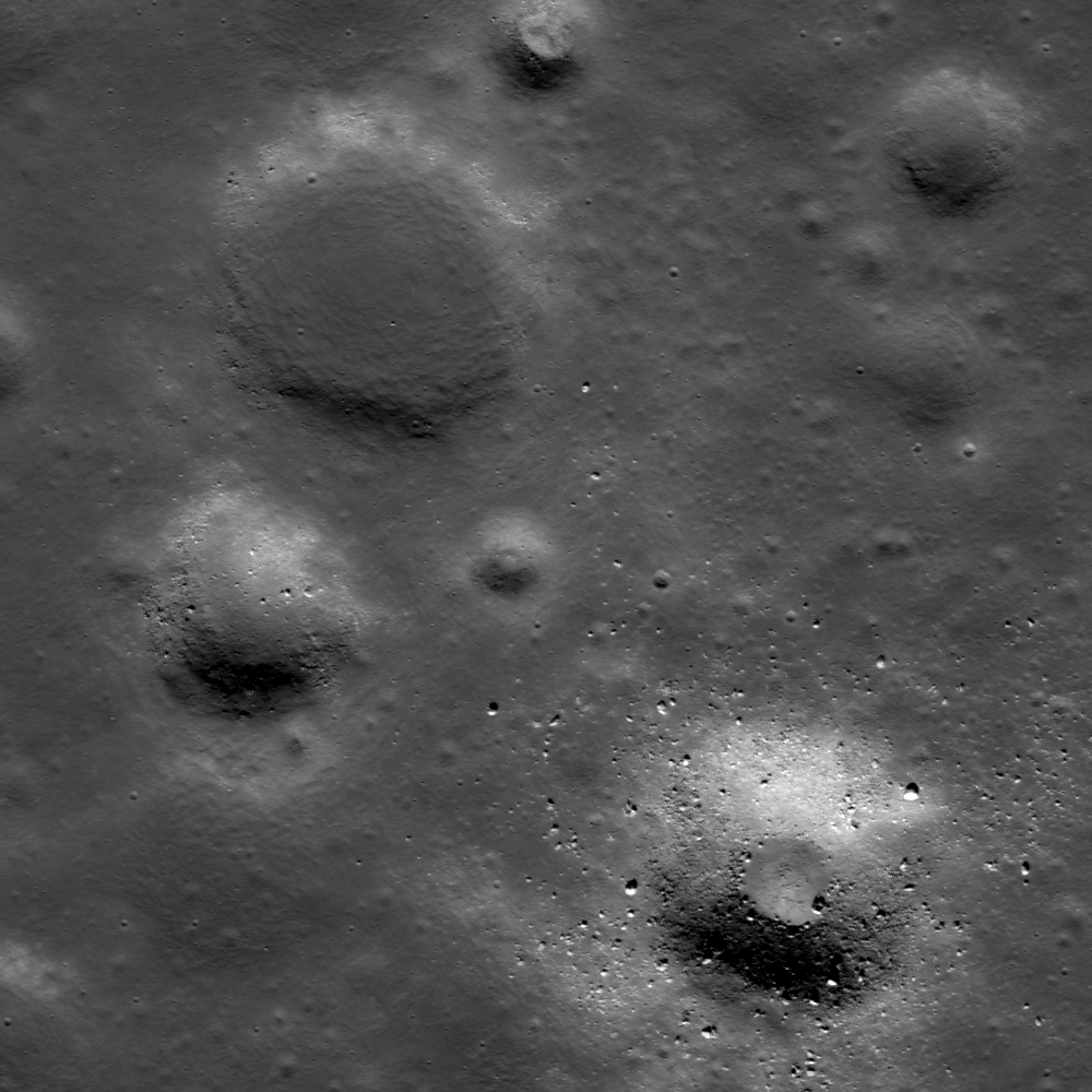 The walls of of the younger crater (lower right) are steeper with a small and nearly flat floor, probably from pooled impact melt. On the other hand, the older crater (upper left) appears much shallower and flatter due to an extensive amount of infilling. This type of degraded flat-floored crater is common on the maria.