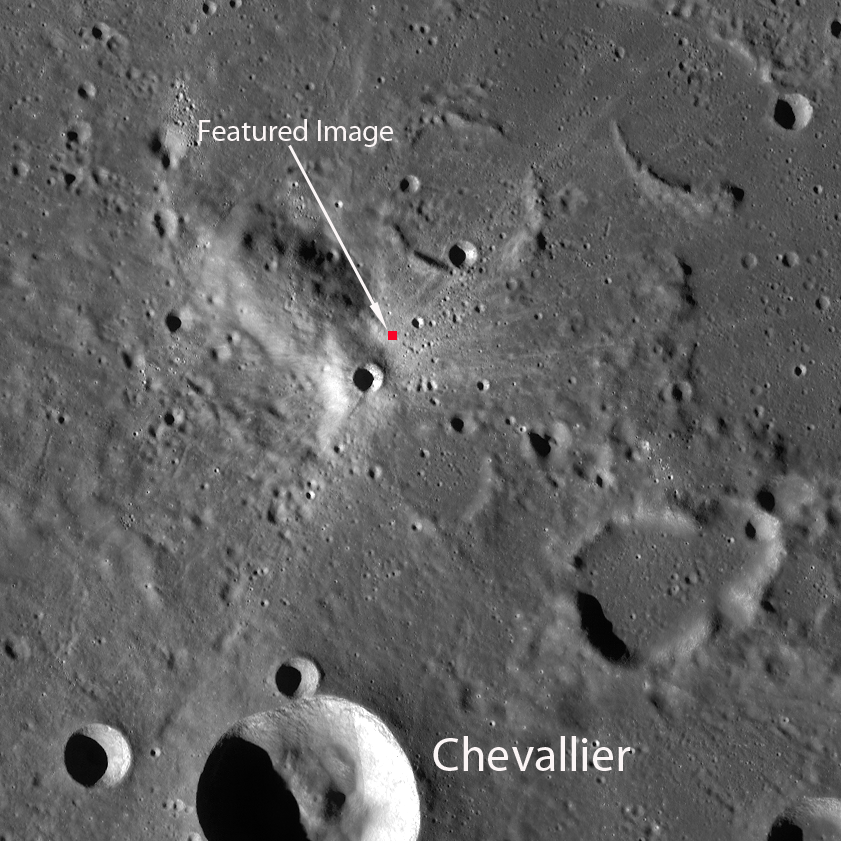 Lunar soil of high and low reflectivity often contrast in spectacular ways where recent impacts have disturbed the regolith. This small crater (3 km diameter) just north of Chevallier, near Lacus Temporis, demonstrates the effect that bright rays can have on the surrounding darker target material.