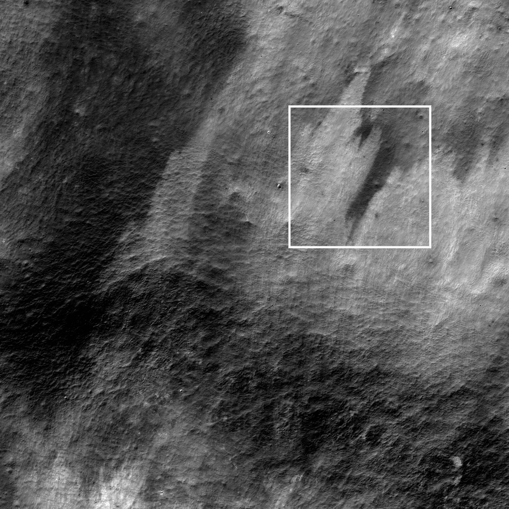 Explore the full NAC image below. Other examples of high-contrast surface deposits can be seen in Action Shot, Polka-dot Ejecta, Dark Wisps in Copernicus, Ejecta Sweeps the Surface, and Dark-haloed crater in Mare Humorum.
